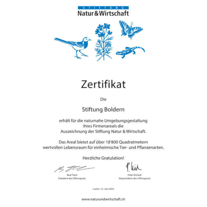 Die Stiftung Boldern wurde von der Stiftung Natur & Wirtschaft im Jahr 2023 mit dem Qualitätslabel für naturnahe Umgebungsgestaltung ausgezeichnet. Diese Zertifizierung würdigt das Engagement der Stiftung Boldern für eine umweltfreundliche, biodiversitätsfördernde und naturnahe Gestaltung ihres Areals.